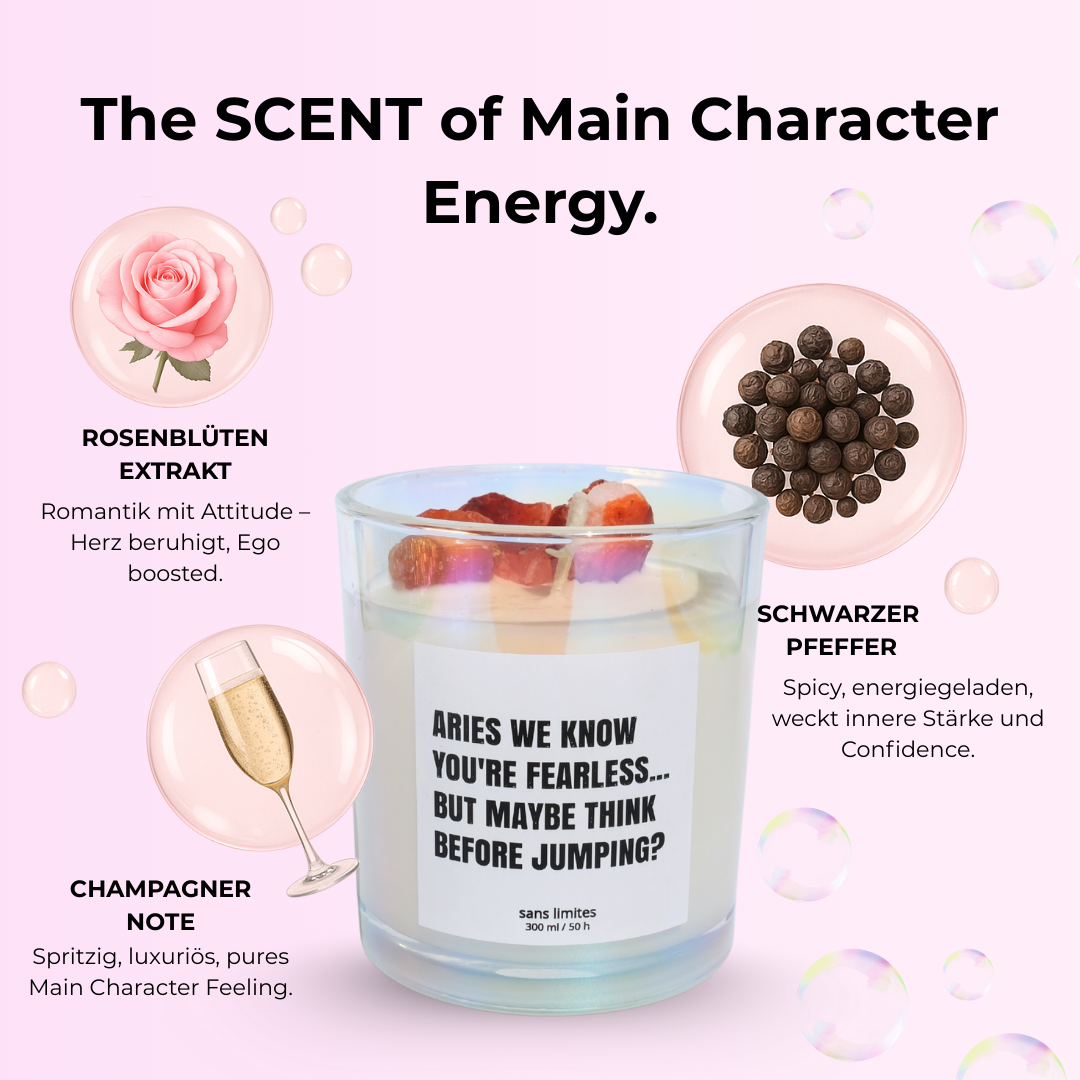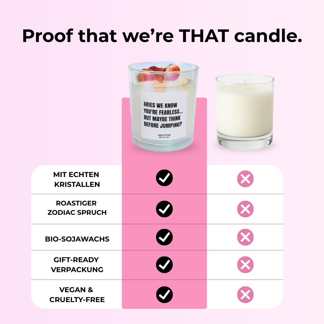 Endlich mal eine Astro-Brand, die nicht nur schnulzig ist, sondern genau meinen Humor trifft. Die Sprüche sind savage, die Kerze sieht mega hochwertig aus und der Kristall darin macht’s richtig besonders.