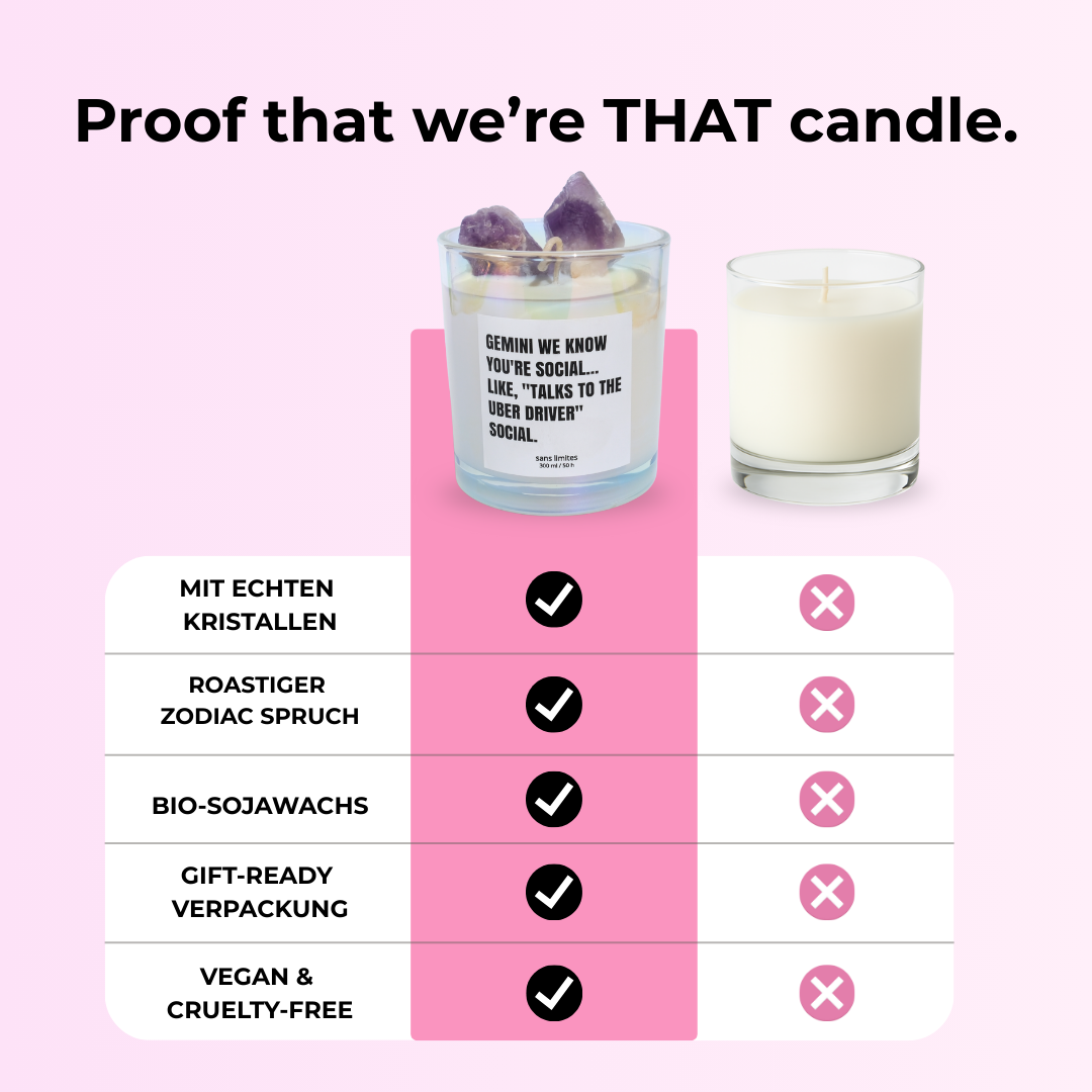 Endlich mal eine Astro-Brand, die nicht nur schnulzig ist, sondern genau meinen Humor trifft. Die Sprüche sind savage, die Kerze sieht mega hochwertig aus und der Kristall darin macht’s richtig besonders.