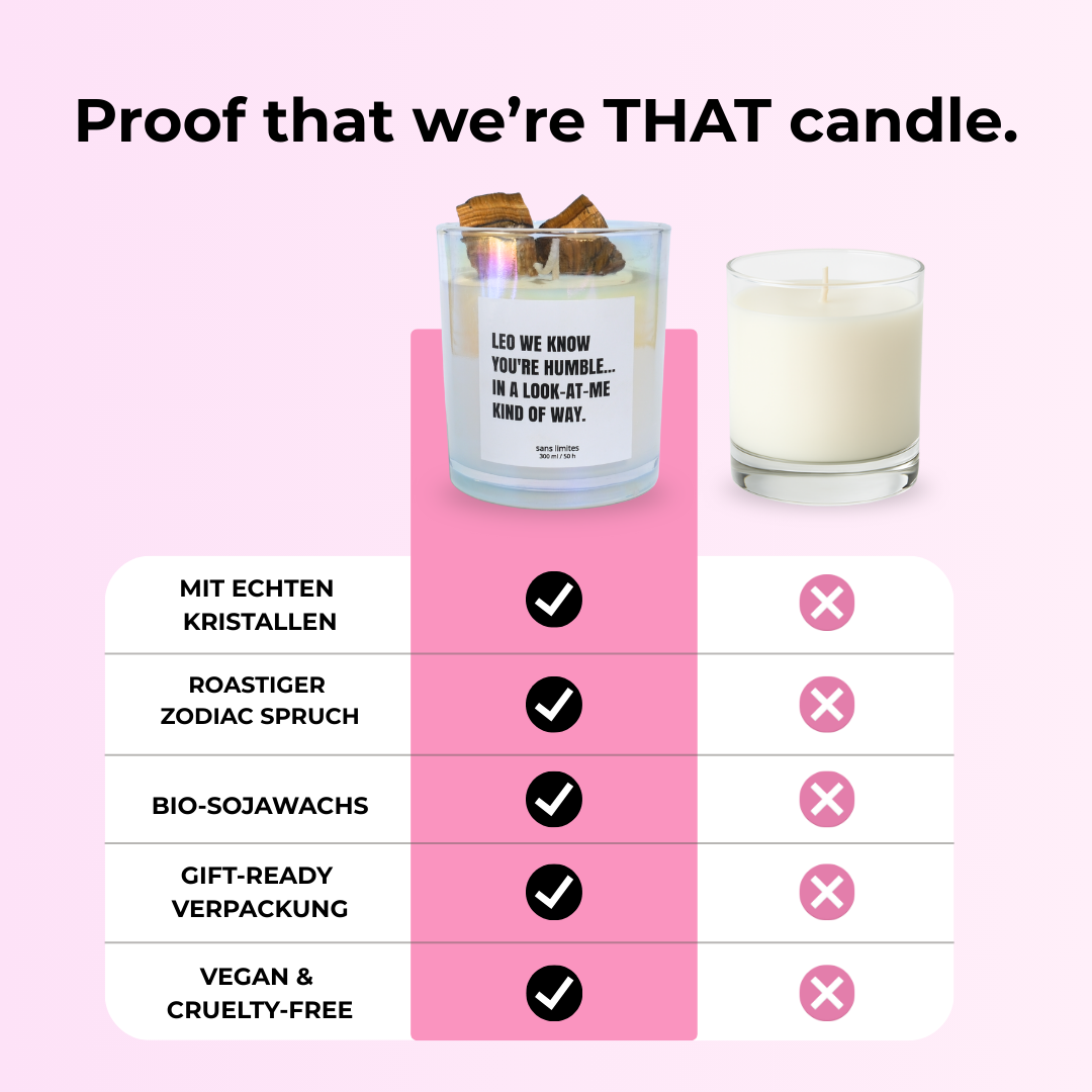 Endlich mal eine Astro-Brand, die nicht nur schnulzig ist, sondern genau meinen Humor trifft. Die Sprüche sind savage, die Kerze sieht mega hochwertig aus und der Kristall darin macht’s richtig besonders.