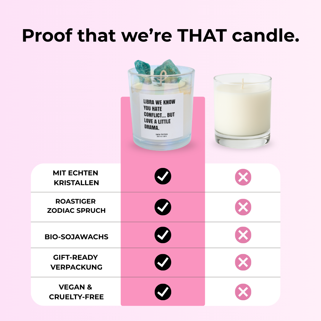 Endlich mal eine Astro-Brand, die nicht nur schnulzig ist, sondern genau meinen Humor trifft. Die Sprüche sind savage, die Kerze sieht mega hochwertig aus und der Kristall darin macht’s richtig besonders.