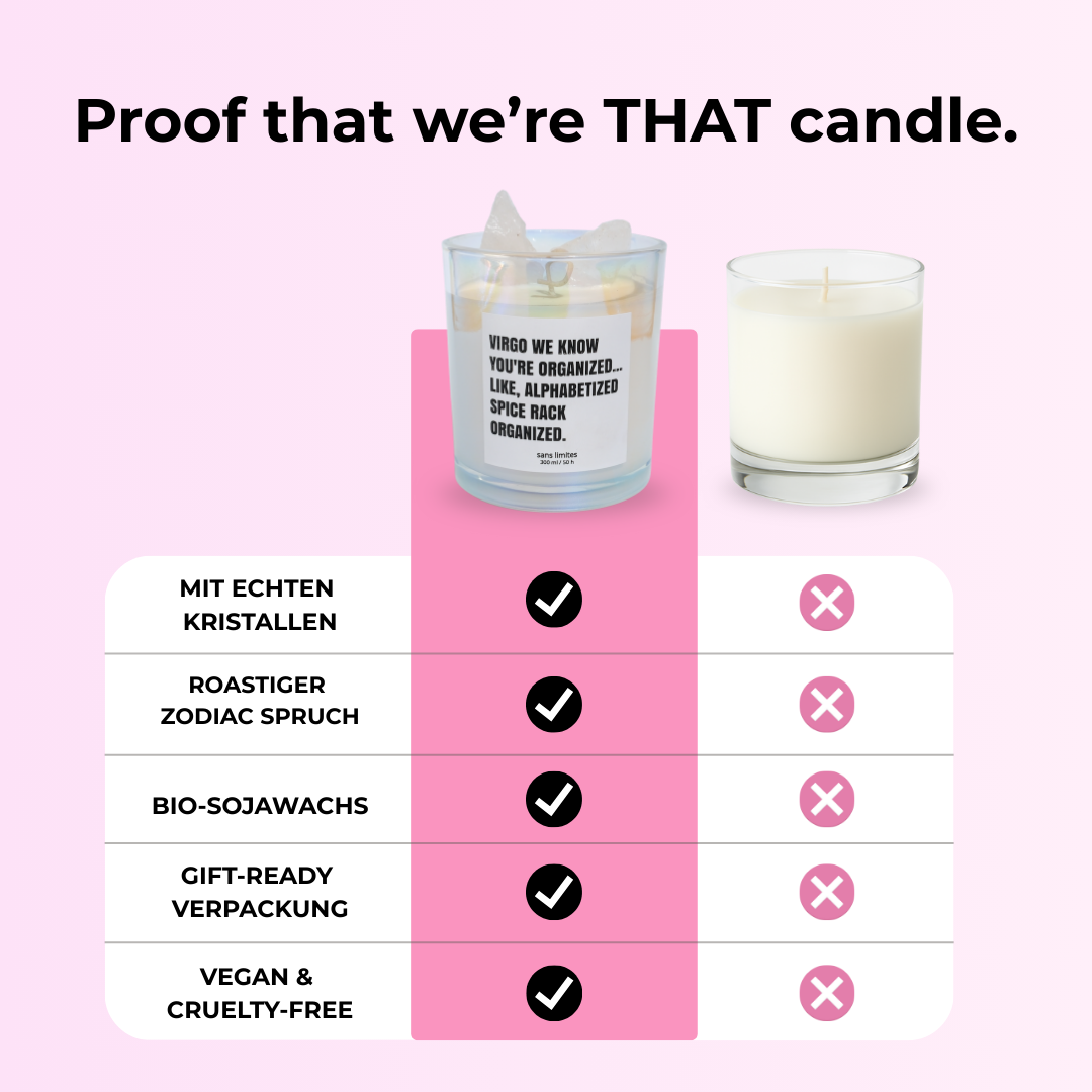 Endlich mal eine Astro-Brand, die nicht nur schnulzig ist, sondern genau meinen Humor trifft. Die Sprüche sind savage, die Kerze sieht mega hochwertig aus und der Kristall darin macht’s richtig besonders.